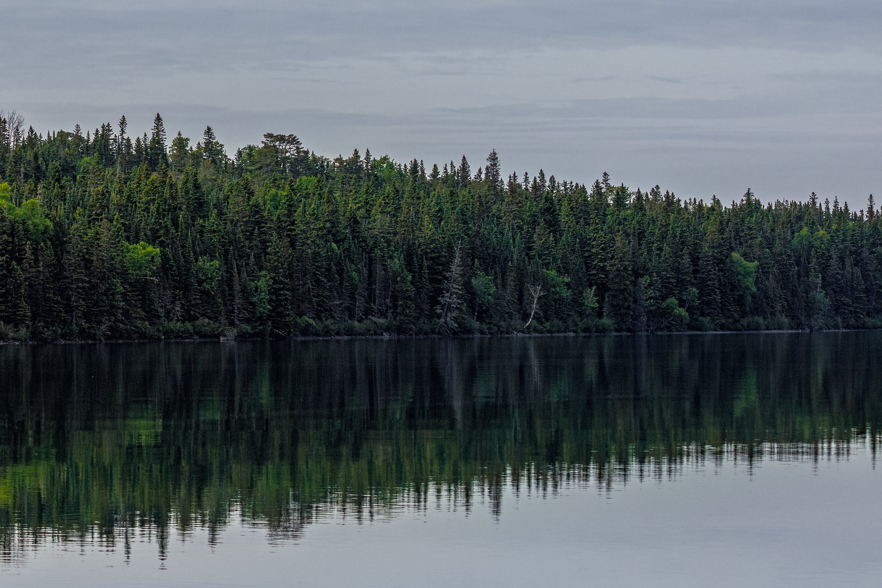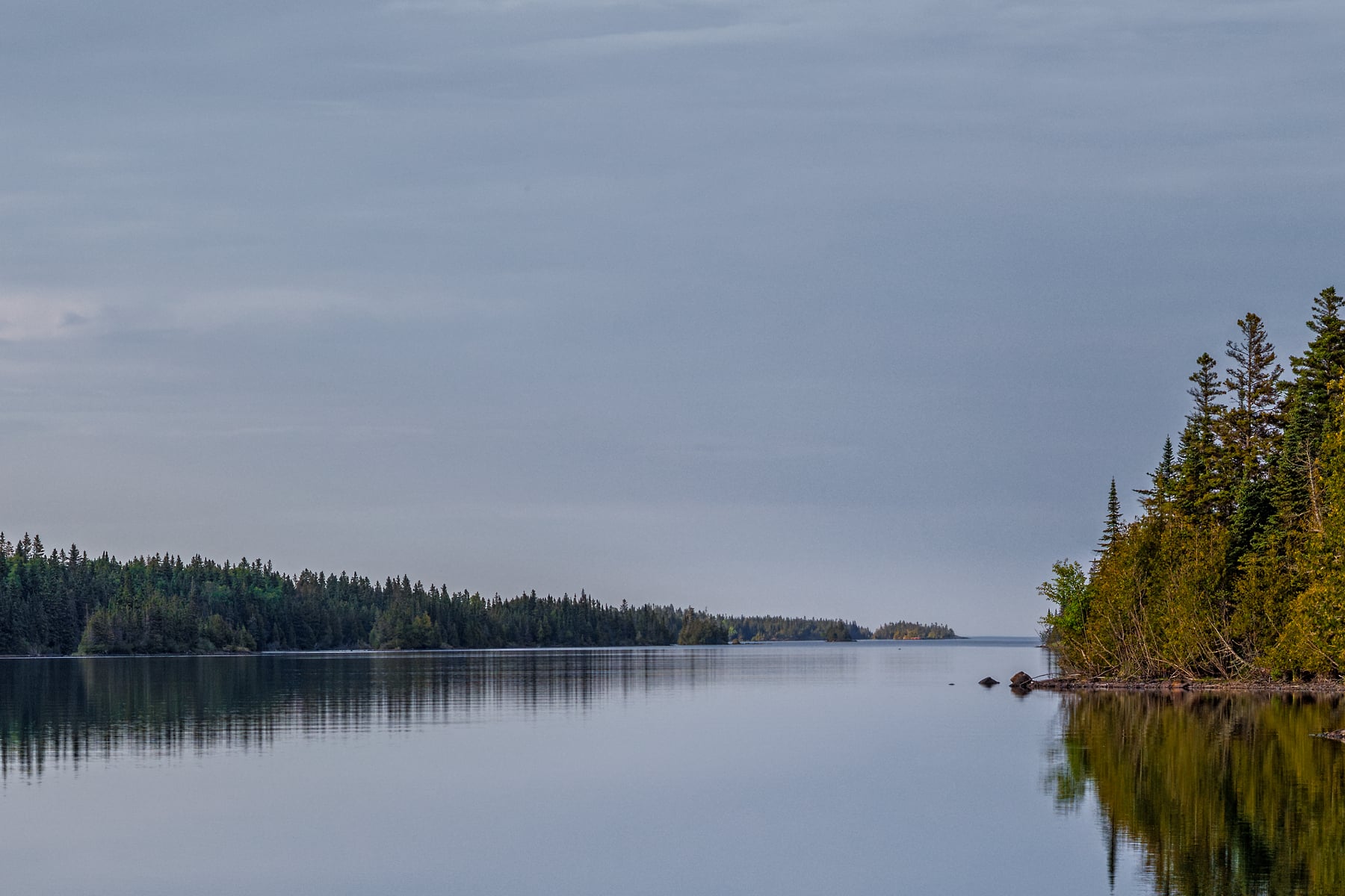 I made the short hike from Rock Harbor late in the afternoon, hoping the light would break through the shifting clouds. Isle Royale is shaped by wind, water, and isolation, and calm conditions are never guaranteed. On this day, though, the wind finally died and the harbor turned to glass. The stillness created a near perfect reflection of the treeline and clouds a quiet, symmetrical moment that captures the essence of the island: remote, understated, and shaped by the northern wilderness.