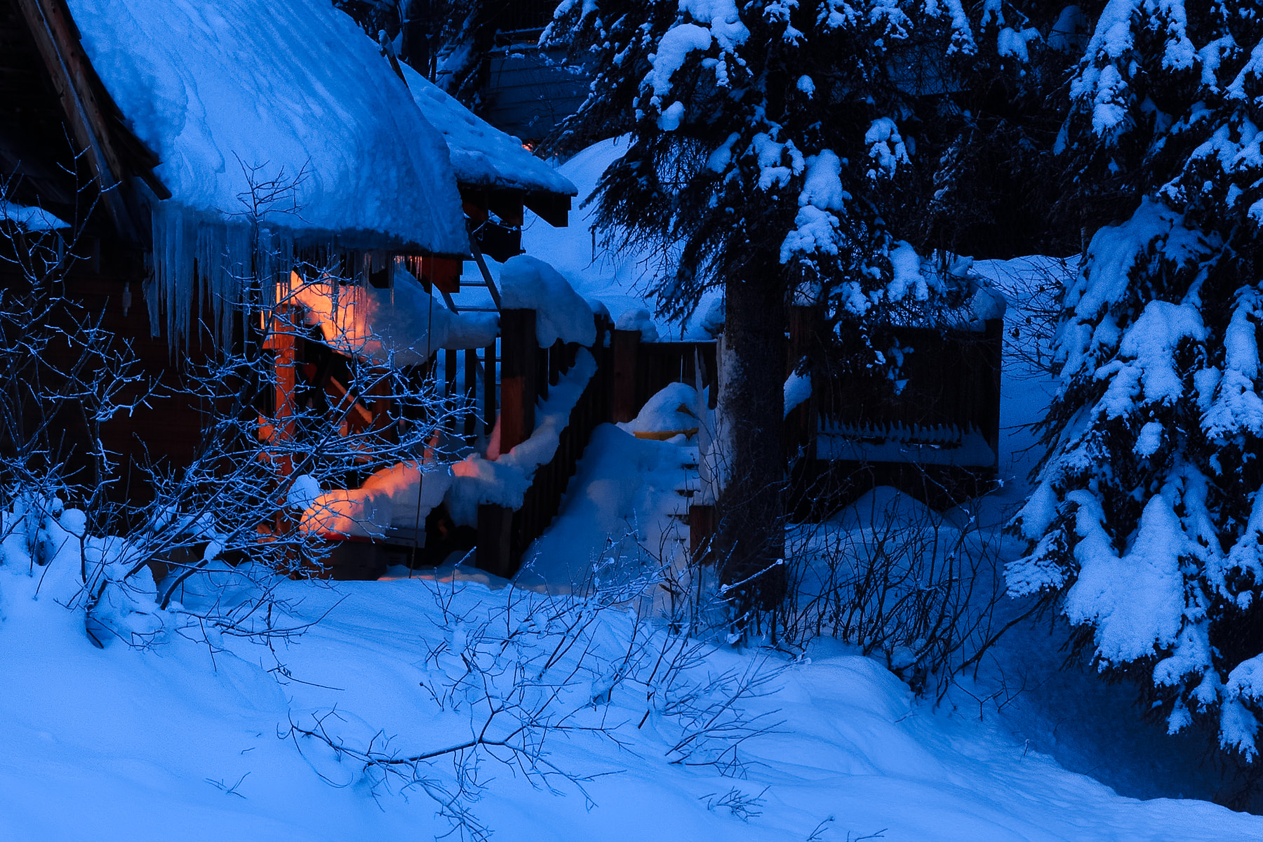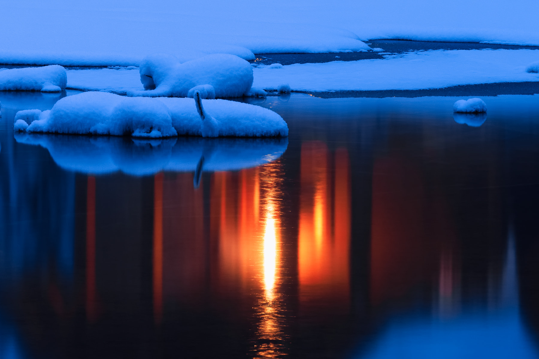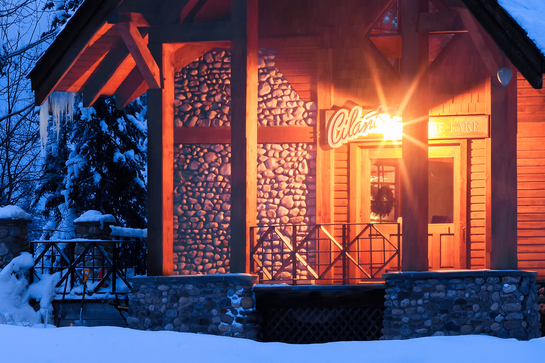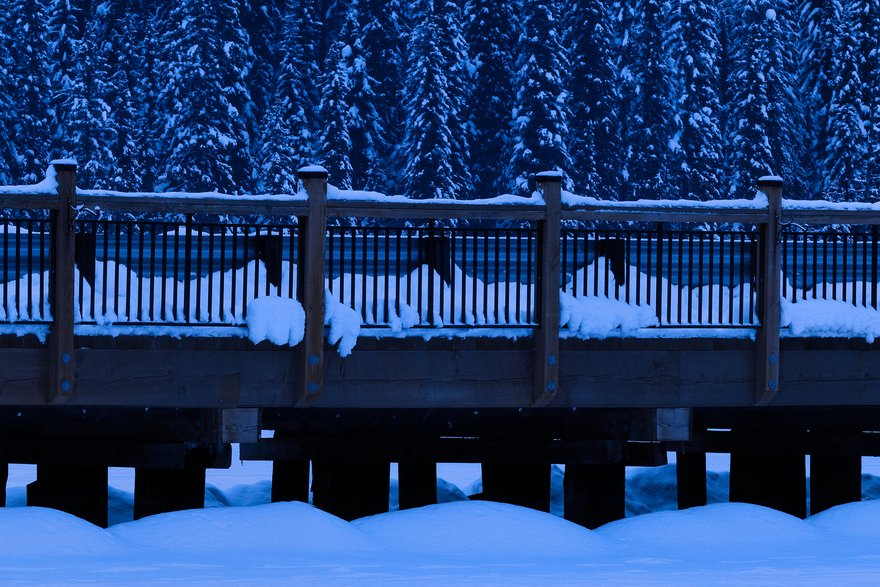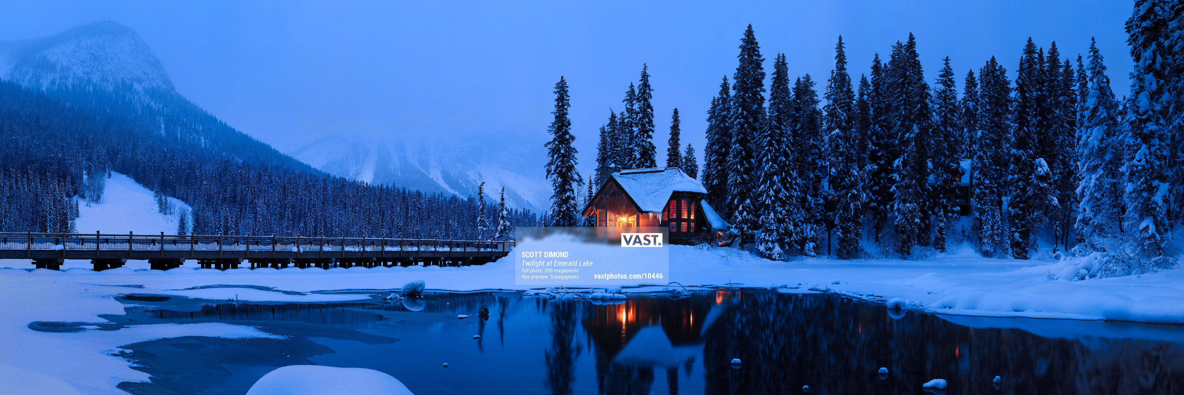 The color of Emerald Lake is most spectacular in July and August when the glaciers containing the sediment melt somewhat in the summer heat. July and August are also busy times with tourists flocking to the area. This image was created at the end of December, a much quieter time at the lake, but also a time with an abundance of snow but open water. Photographed at dusk, with the illuminated lodge reflected in the water, the beauty of the solitude of Emerald Lake is revealed.