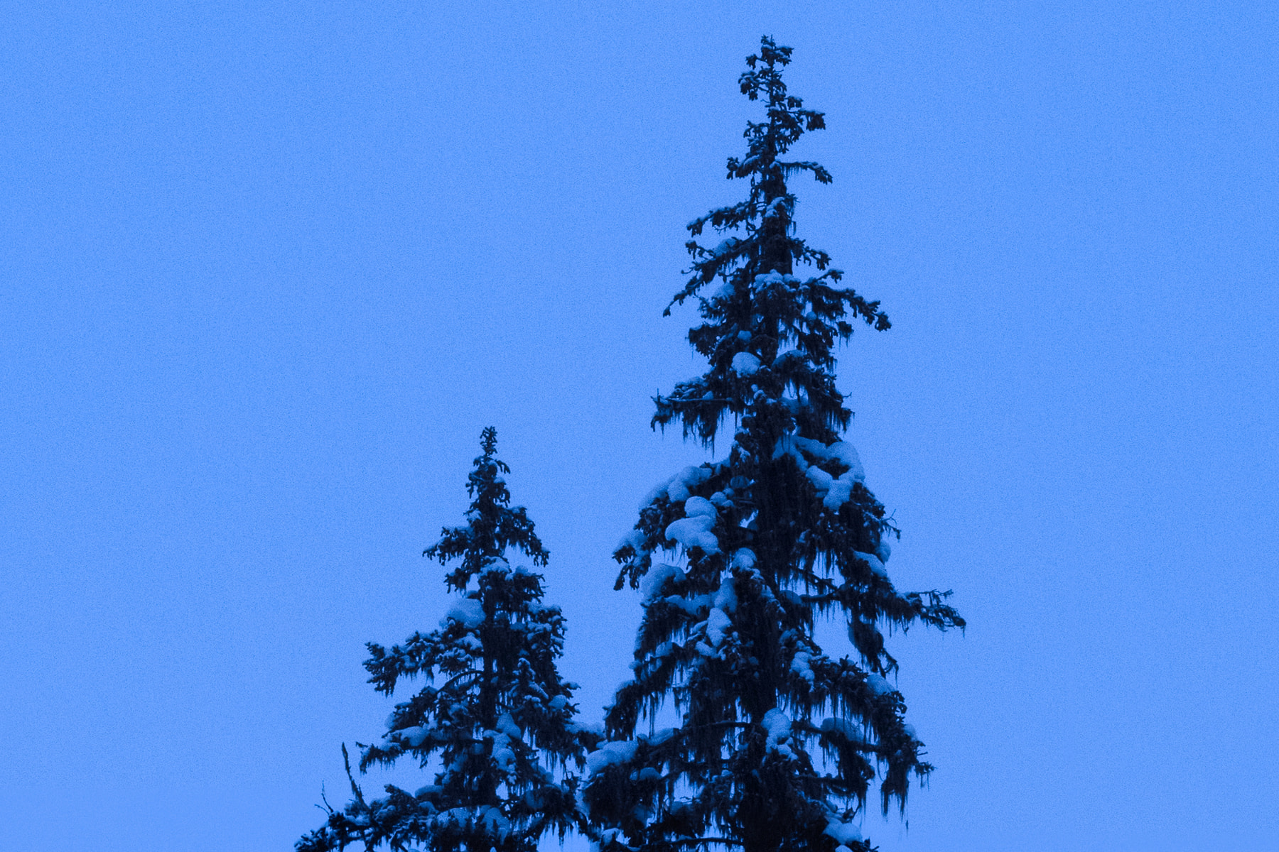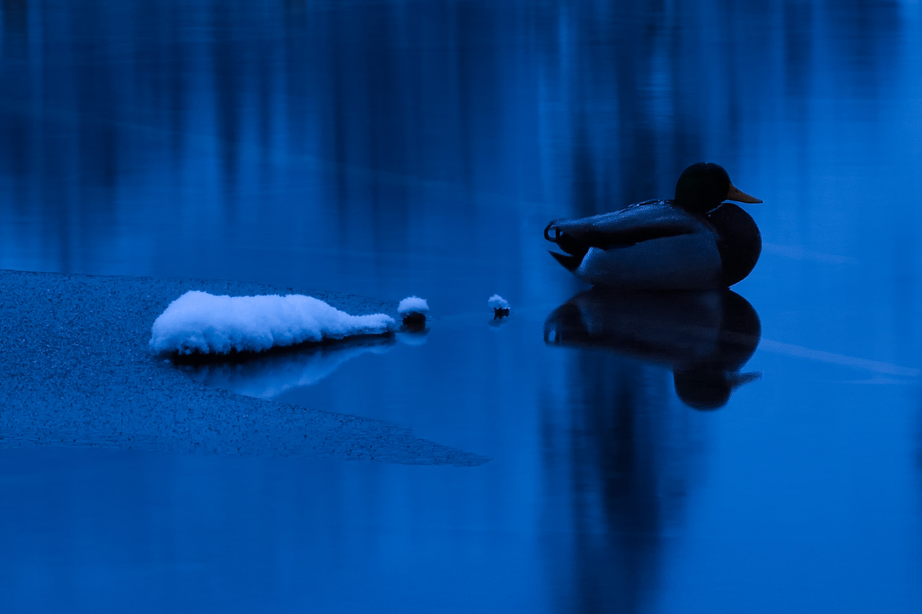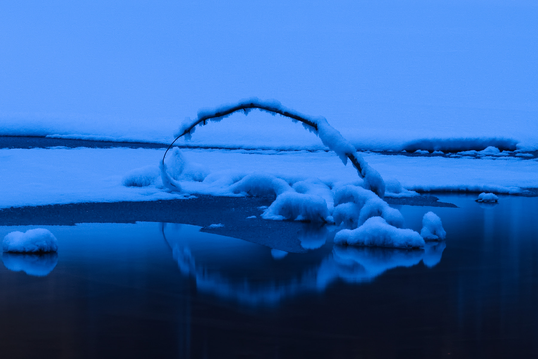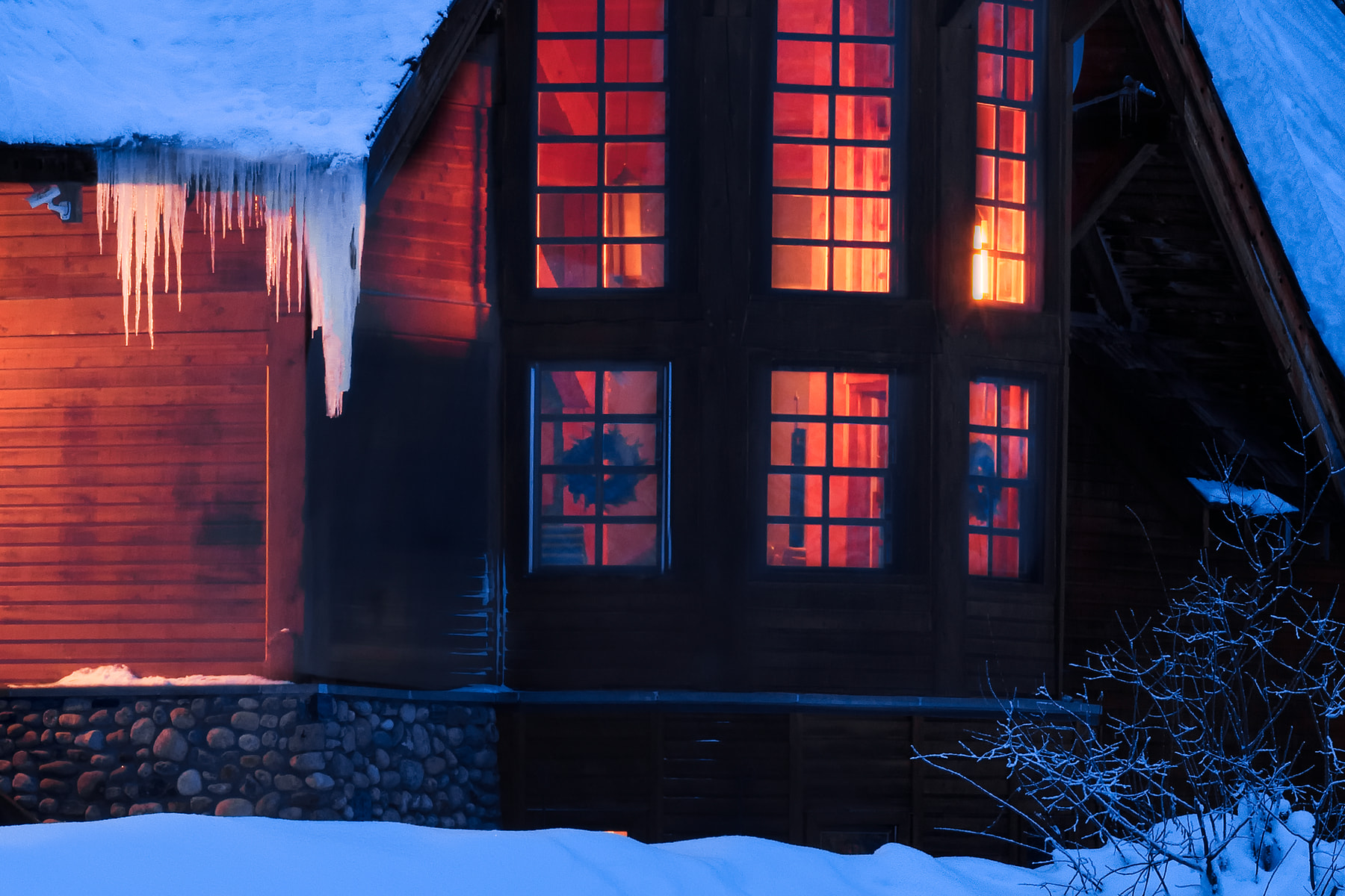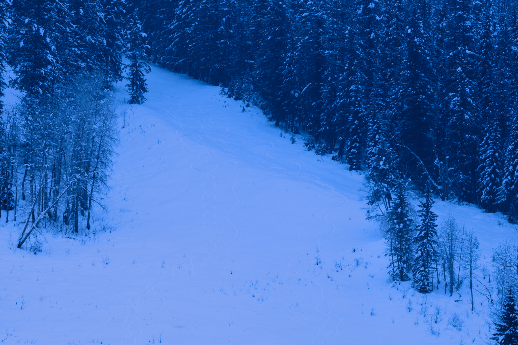 The color of Emerald Lake is most spectacular in July and August when the glaciers containing the sediment melt somewhat in the summer heat. July and August are also busy times with tourists flocking to the area. This image was created at the end of December, a much quieter time at the lake, but also a time with an abundance of snow but open water. Photographed at dusk, with the illuminated lodge reflected in the water, the beauty of the solitude of Emerald Lake is revealed.