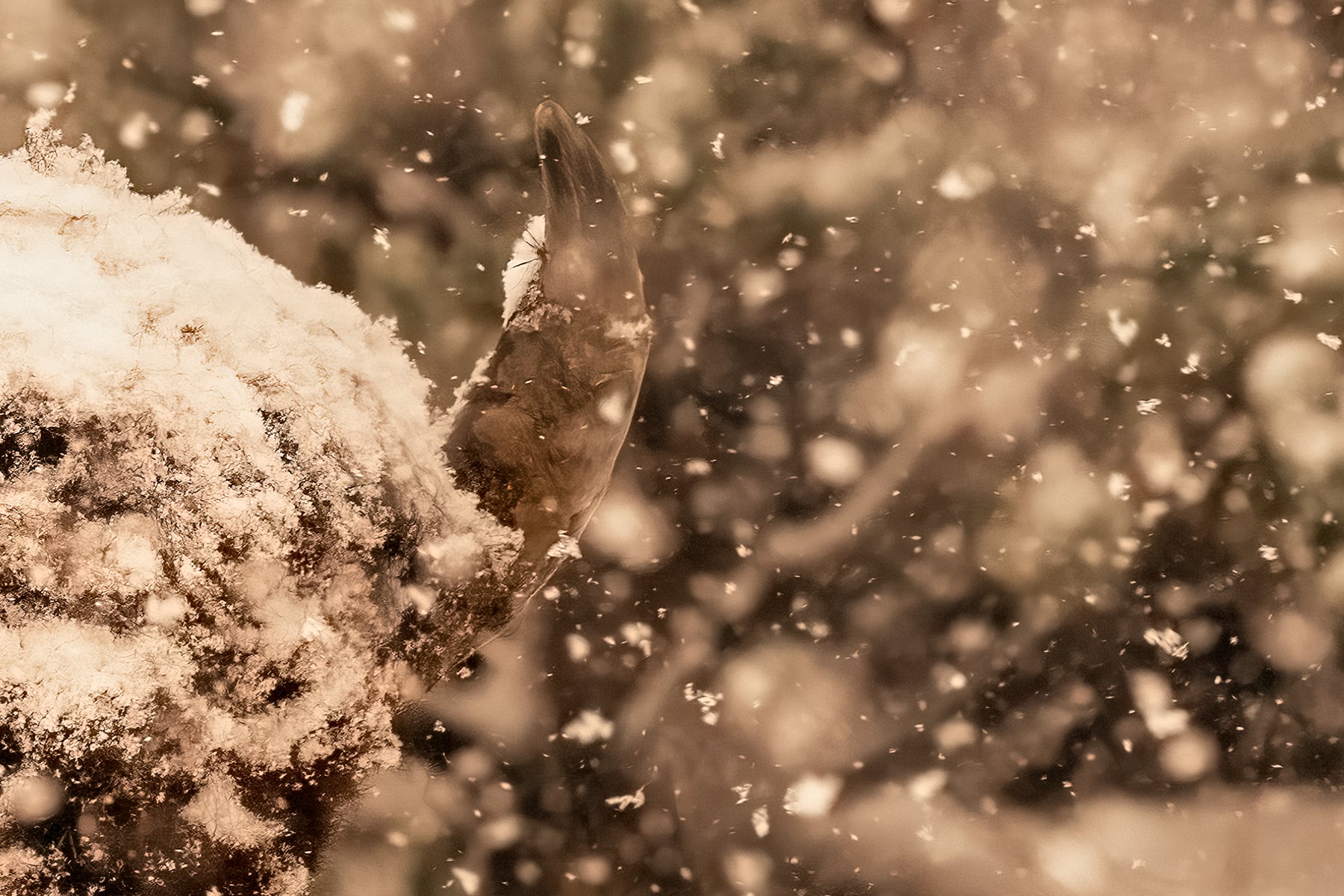 Months later when I got around to processing this image, I was at first disappointed with the results. It looked like the whole thing was a bust. The problem was, it appeared that not a single one of the hundreds of photos taken had the bison in focus. It was snowing so hard, and the flakes were so large, that the camera was continuously focusing on the falling snow. There are ways to avoid this, and I tried my best, but it appeared to have been in vain.