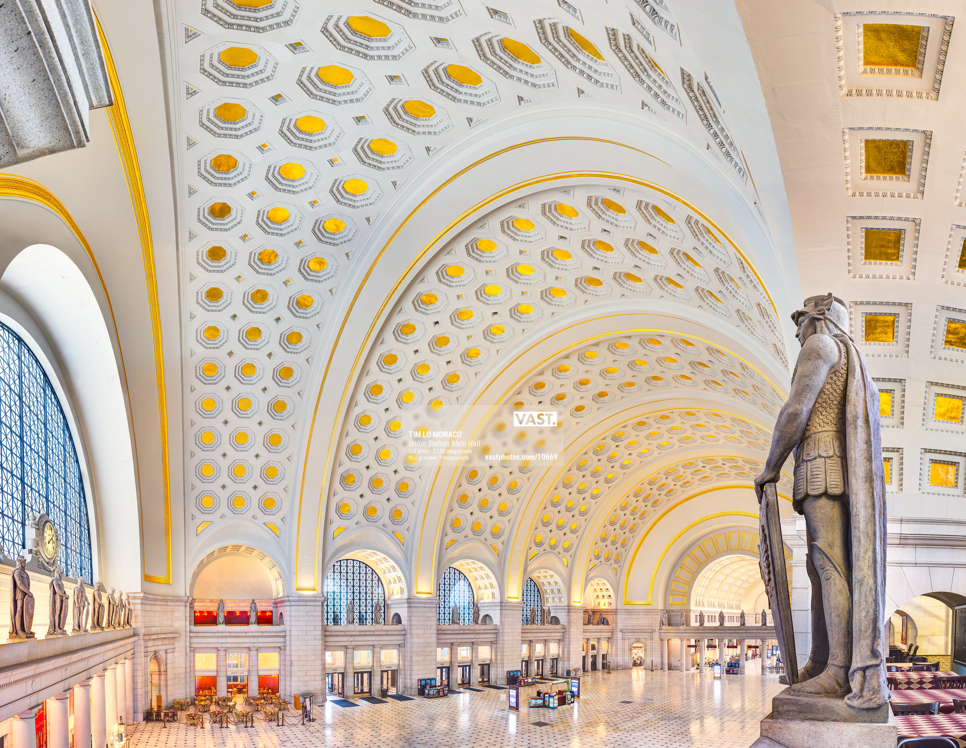 Union Station is the ground transportation hub of Washington, D.C. that provides local, regional and interstate routes for trains and buses. This train station was designed by architect Daniel Burnham and opened in 1907. At the time, the main hall was the largest room ever built. Thirty-six roman legionnaire statues stand guard in the barrel-vaulted main hall with its 255 octagonal gilded coffers of Beaux-arts style architecture. It has undergone extensive restoration in recent years including the reinforcement of the 96-foot high ceiling with steel frames. Among other things, the external restoration included the application of 120,000 sheets of 23-karat gold leafing.