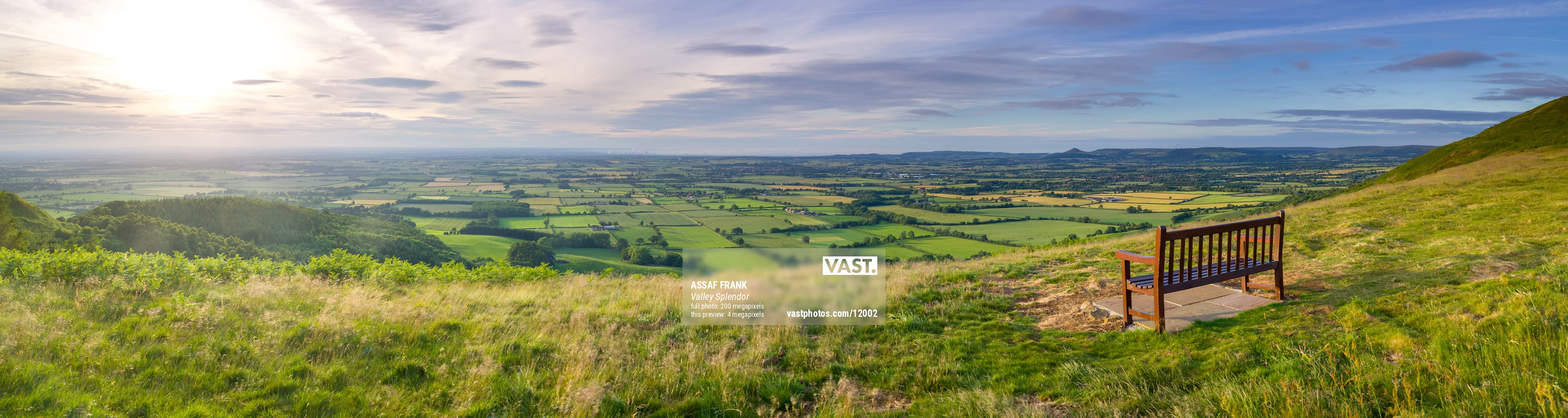 A breathtaking panoramic view from a hillside in Yorkshire, England, capturing the lush green fields and rolling countryside under a soft, golden sunset. A wooden bench sits at the edge of the hill, offering a peaceful spot to admire the vast landscape stretching into the horizon. The sunlight casts a warm glow over the fields, highlighting the natural beauty of the rural scenery.