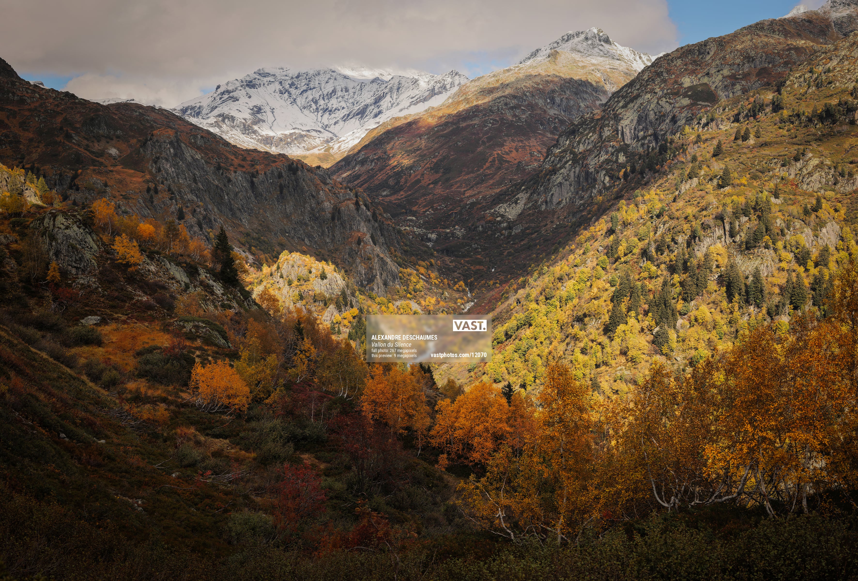 This photograph captures a stunningly wild valley in Haute-Savoie, with the imposing Mont Buet rising in the distance. The scene is a symphony of autumnal colors—fiery oranges, golden yellows, and deep reds spread across the slopes, creating a vivid contrast with the rocky terrain and snow-dusted peaks. The light plays delicately on the landscape, illuminating pockets of forest and drawing the eye toward the heart of the valley.