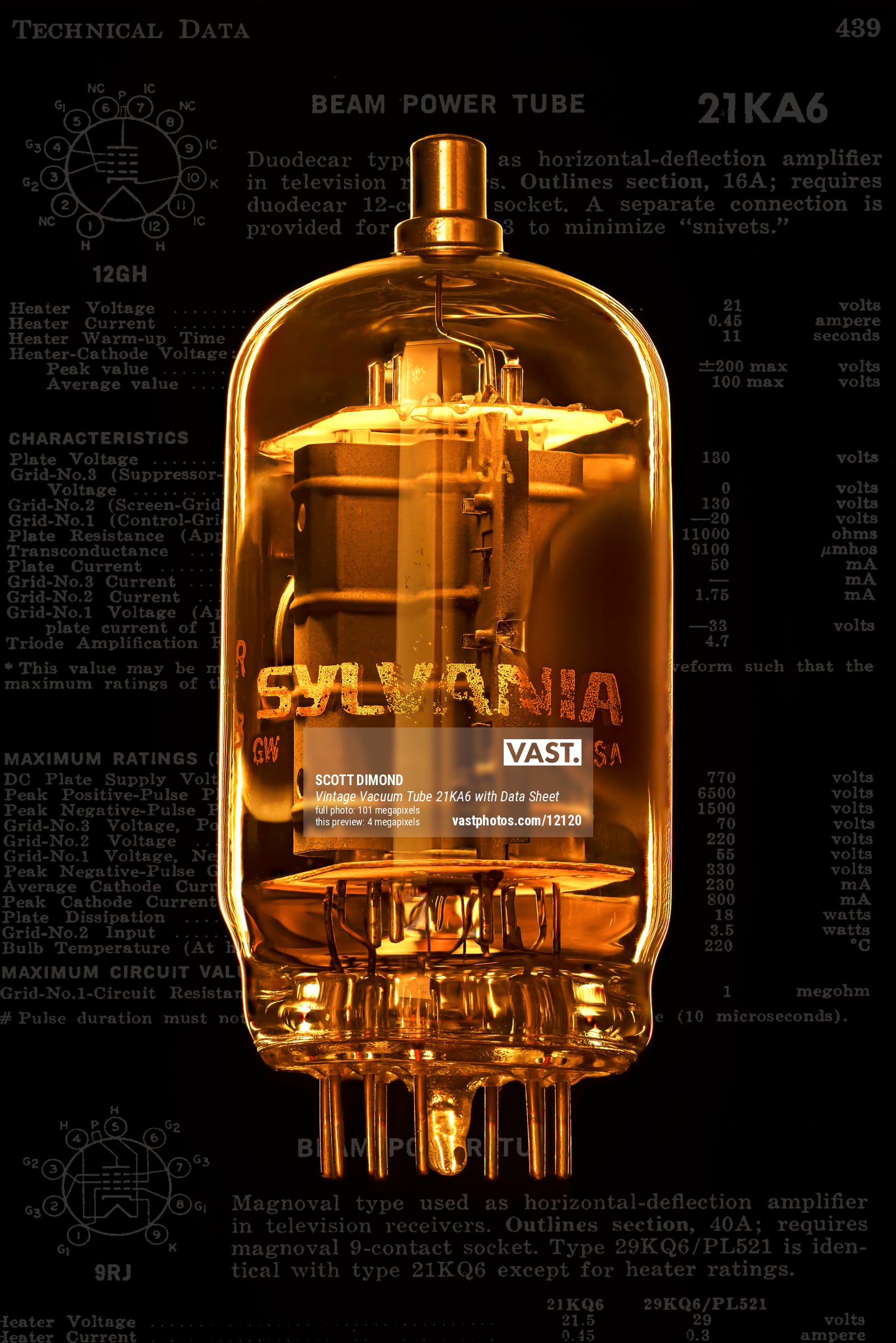 A close-up of "Vintage Vacuum Tube 21KA6 with Data Sheet" by Scott Dimond: an ultra-high-resolution VAST photo.