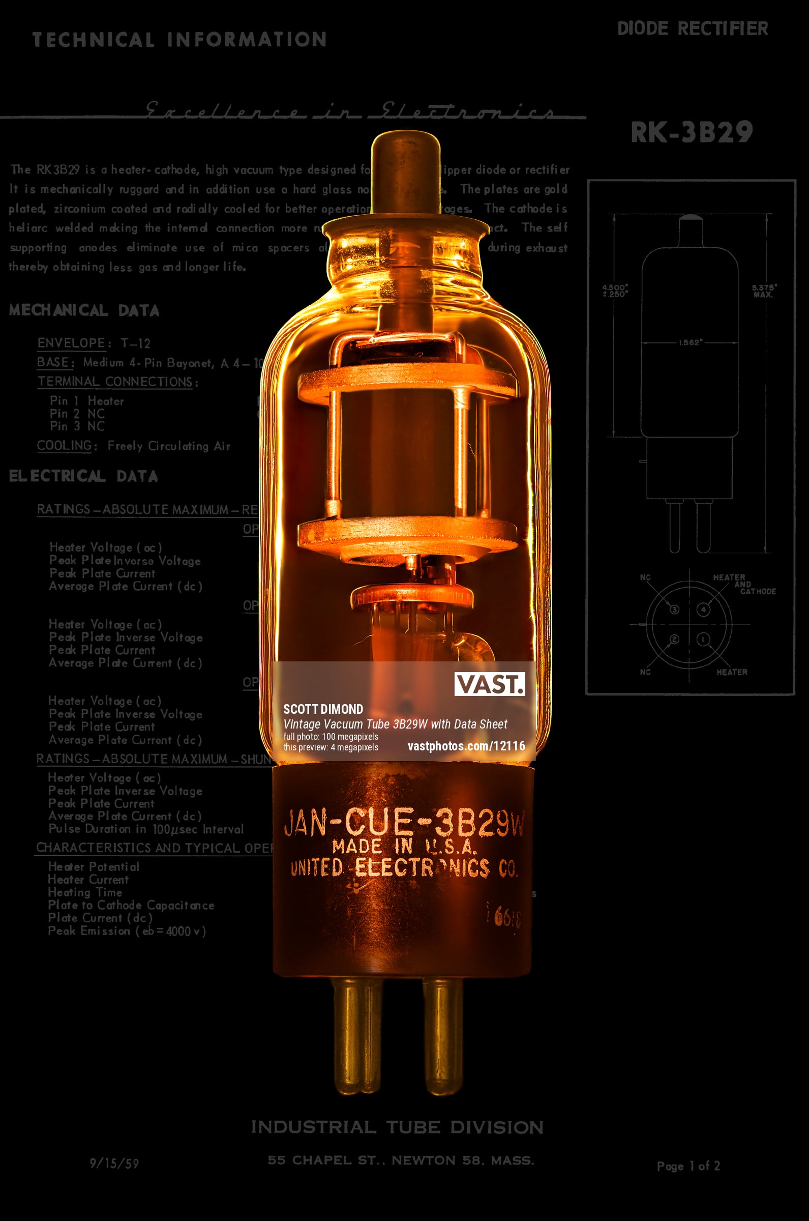 A close-up of "Vintage Vacuum Tube 3B29W with Data Sheet" by Scott Dimond: an ultra-high-resolution VAST photo.