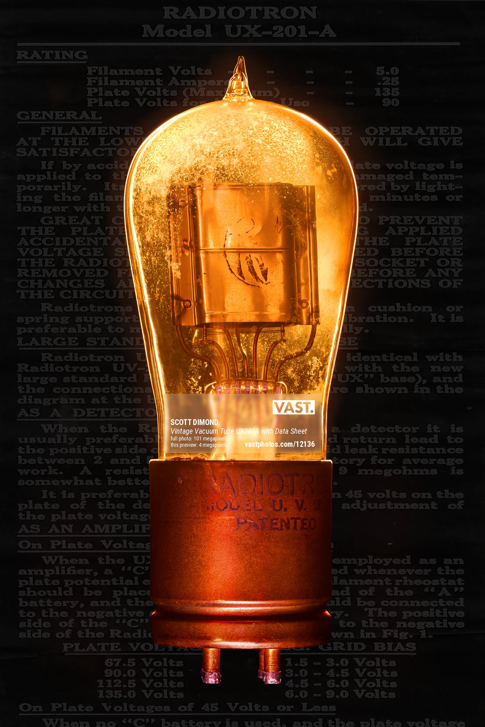 A close-up of "Vintage Vacuum Tube UX201A with Data Sheet" by Scott Dimond: an ultra-high-resolution VAST photo.