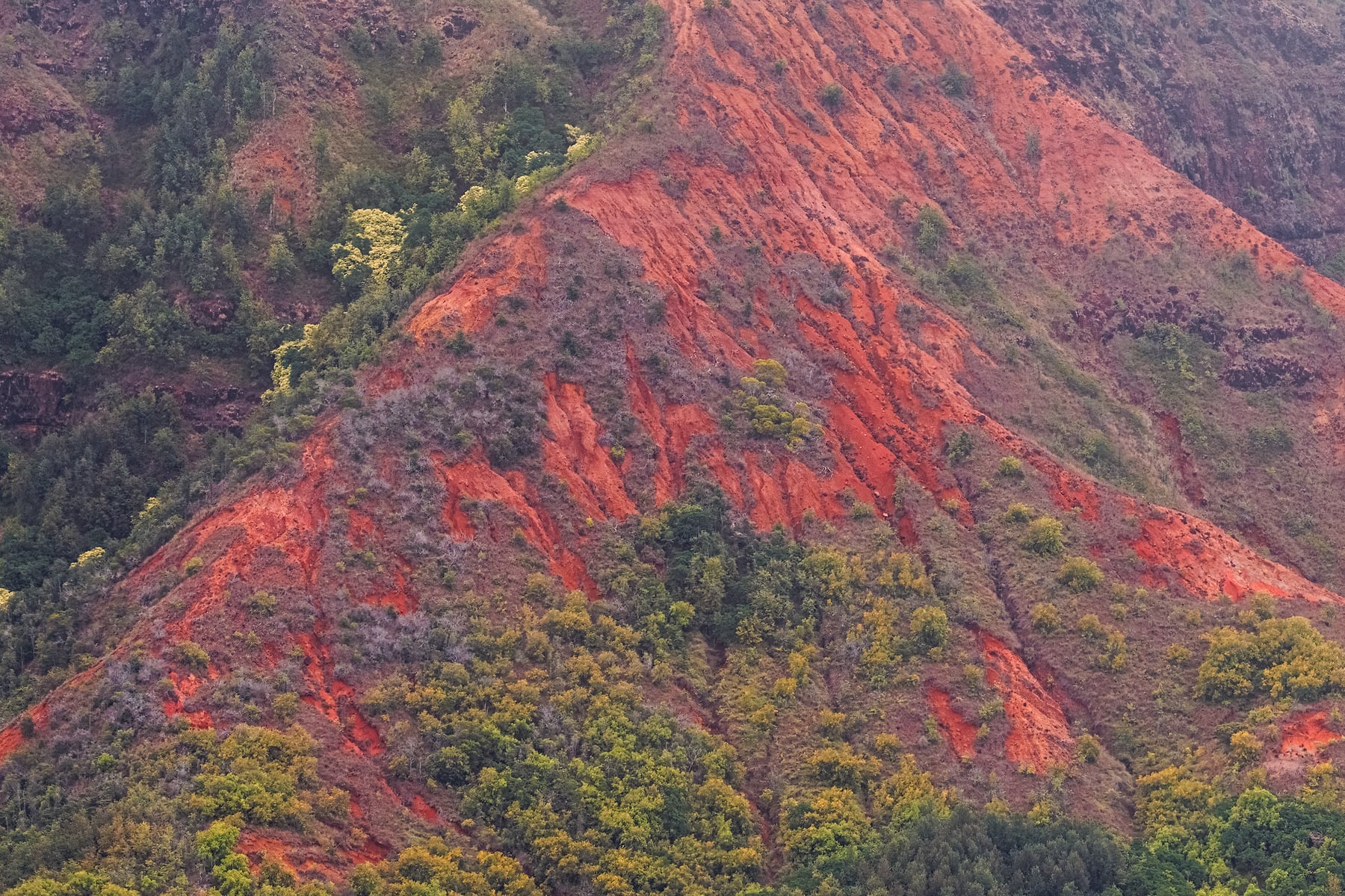 Often called the “Grand Canyon of the Pacific,” Waimea Canyon cuts deeply into the western side of Kauai, revealing layer upon layer of volcanic rock shaped by erosion, rainfall, and the collapse of the ancient shield volcano that formed the island. Its red cliffs, green valleys, and dramatic ridgelines make it one of Hawaii’s most striking inland landscapes.