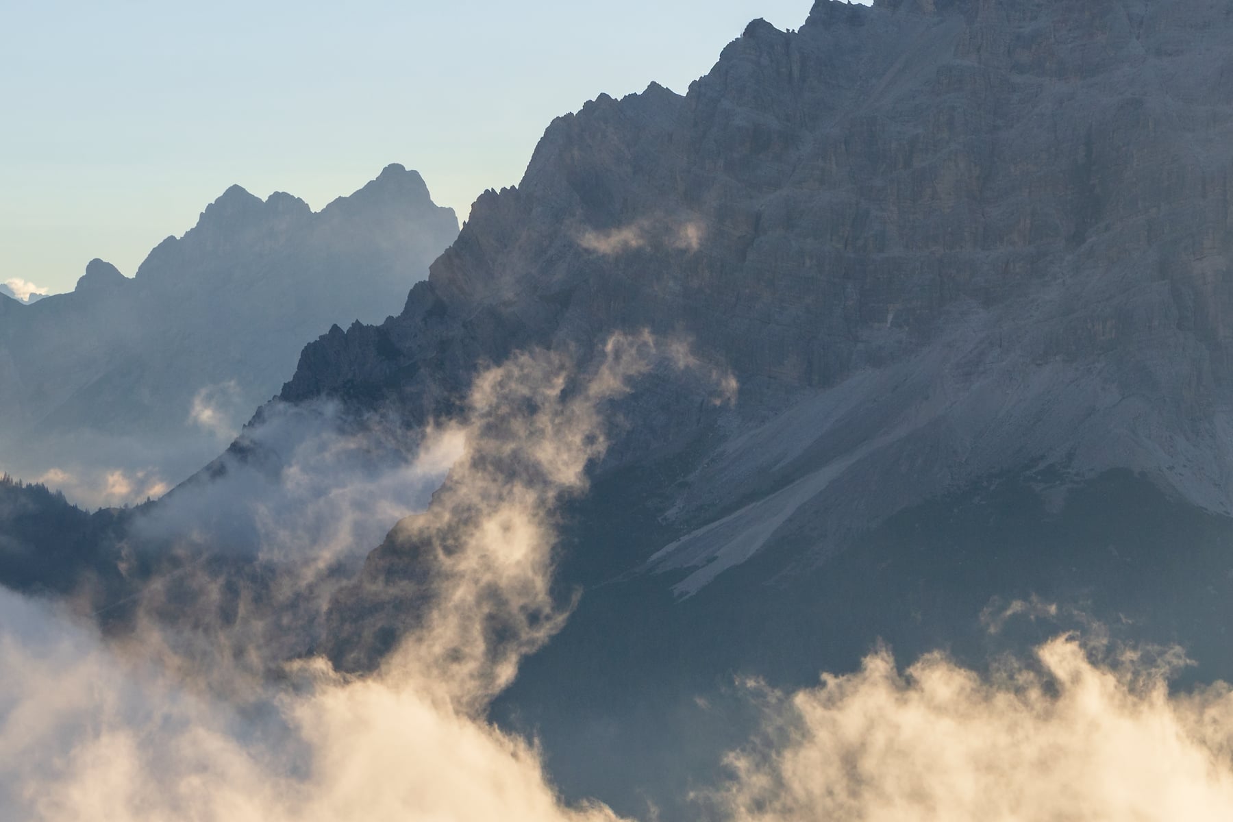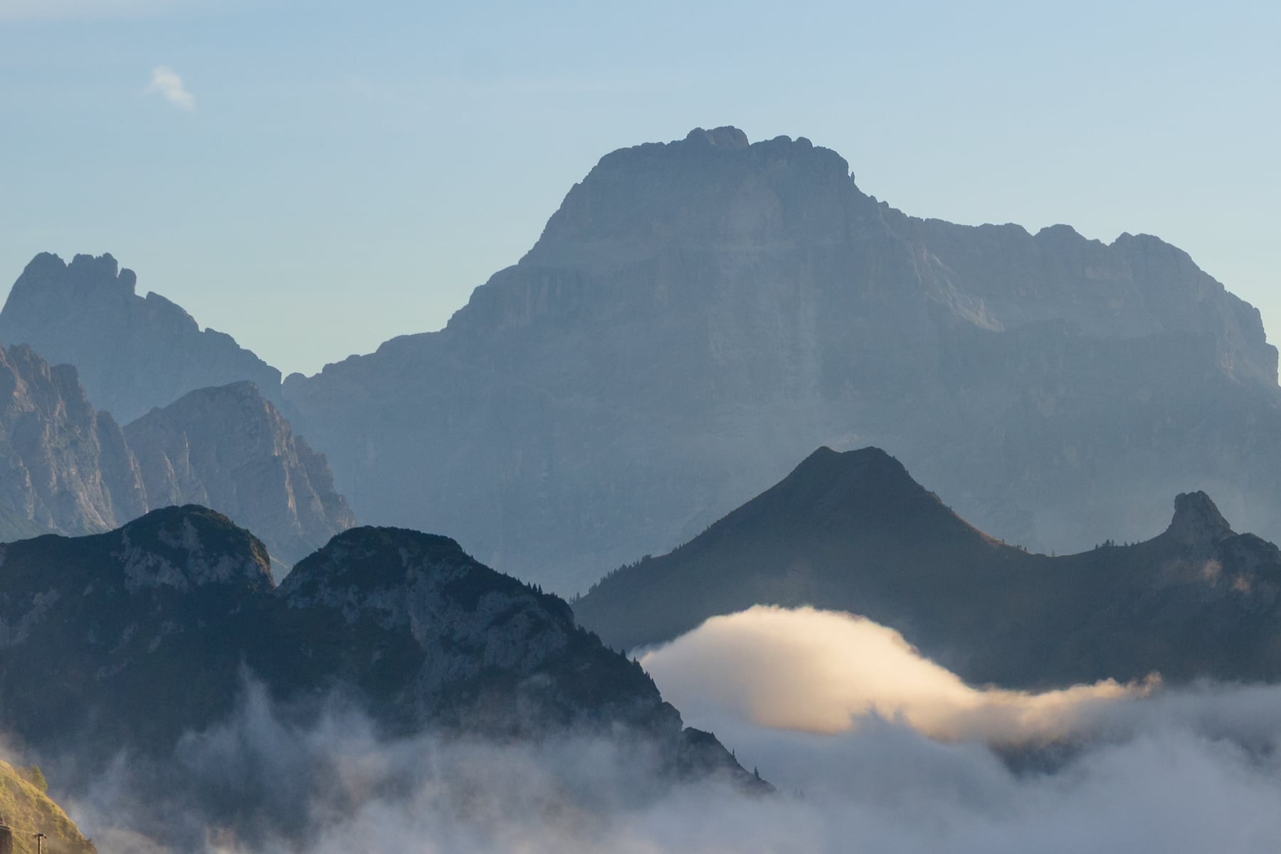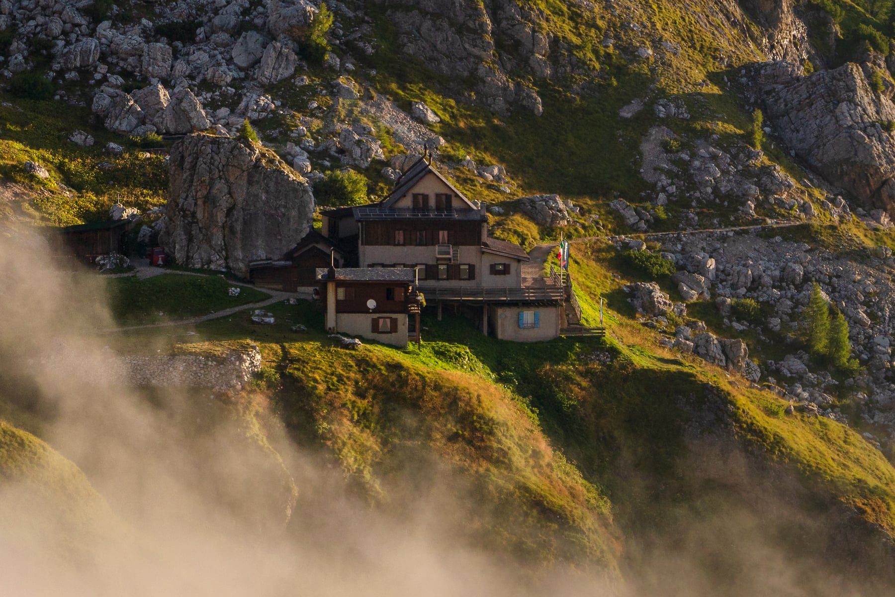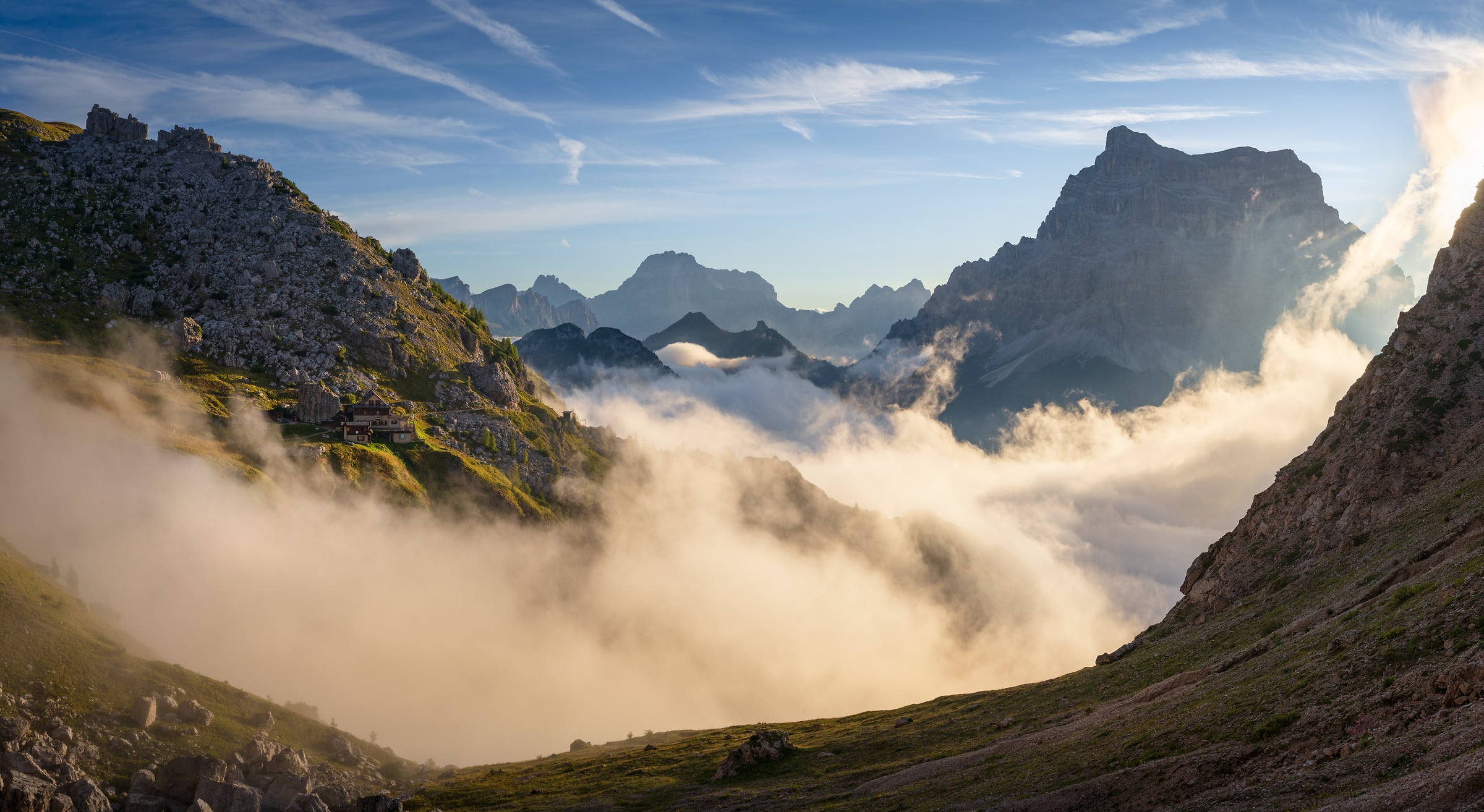 As a lush mountain region, the weather was everchanging and fickle -- there were times when we couldn't see any mountains for days at a time. But all storms break eventually, as long as you're patient! This is one of the photos I was able to capture on a lovely foggy morning, from one of my favorite rifigios that we were able to spend the night in. The fog was changing every moment, and the sunrise light brought everything together!