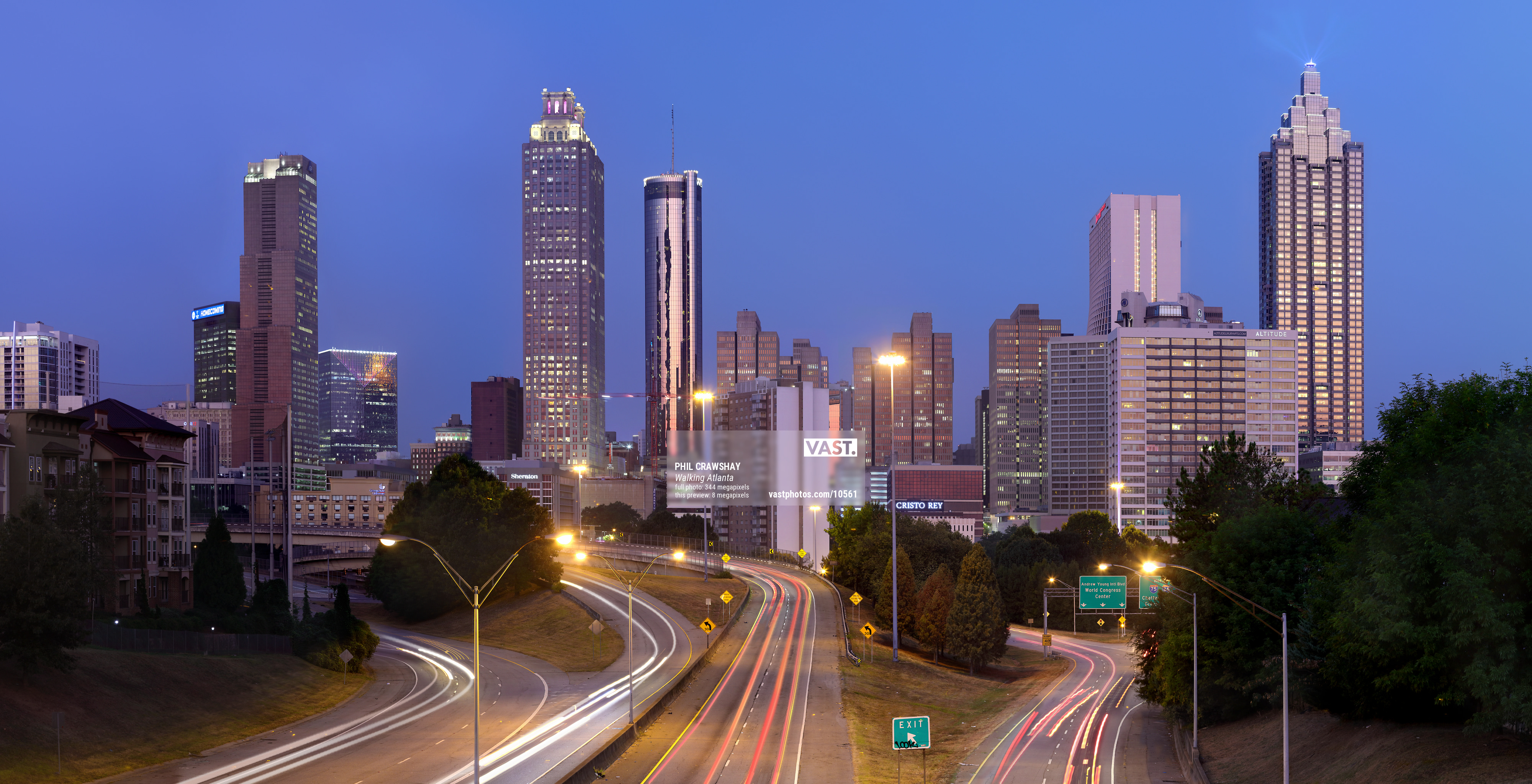 344 megapixels! A very high resolution, large-format VAST photo print of the Atlanta skyline at dusk with highways in the foreground; photograph created by Phil Crawshay in Jackson Street Bridge, Atlanta Georgia.