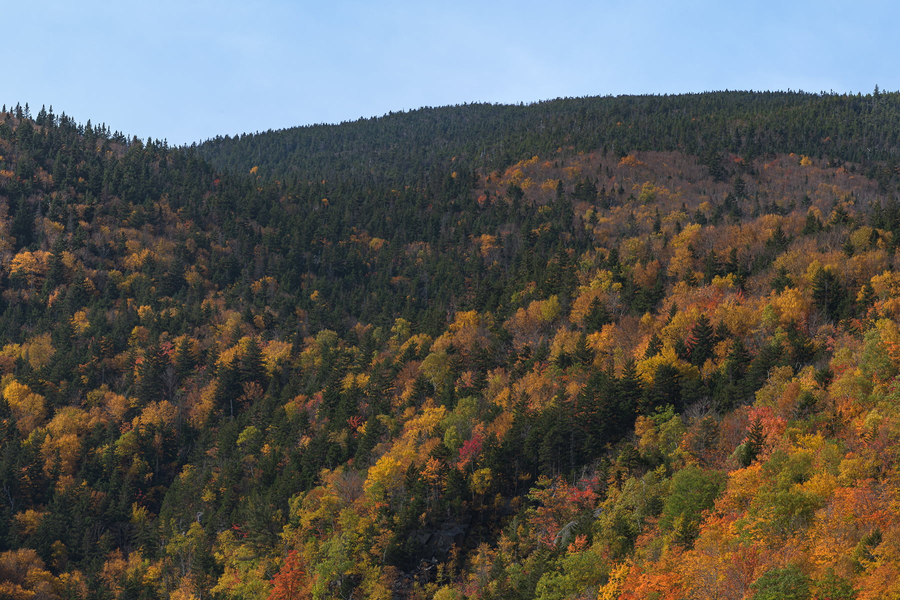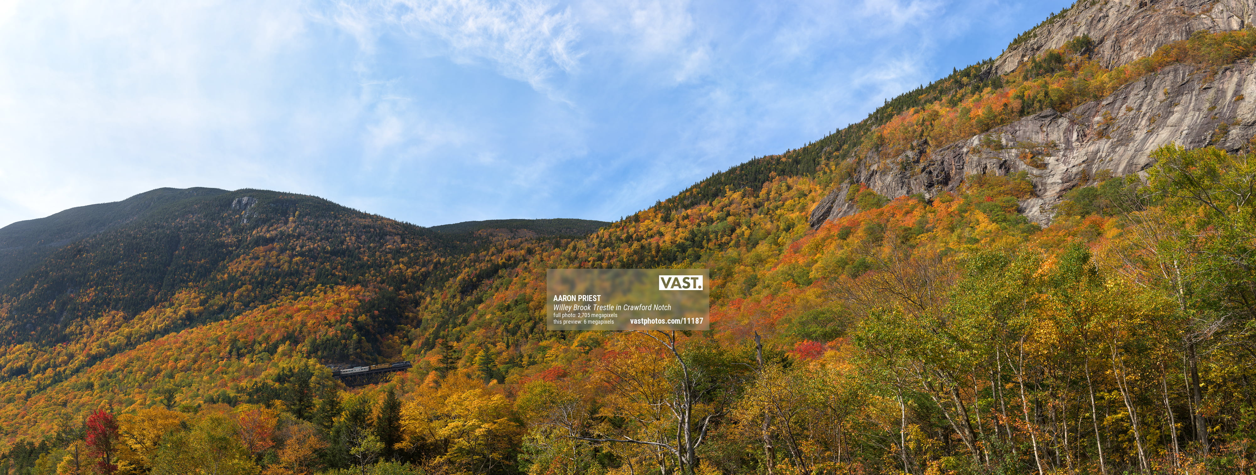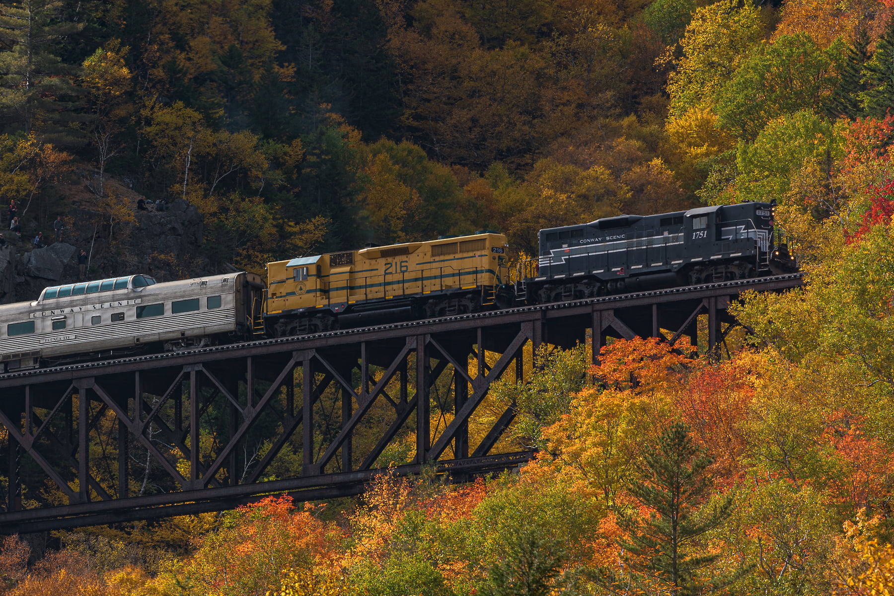 The Conway Scenic Railroad passes over the Willey Brook Trestle at Hart’s Location in the Crawford Notch of the White Mountains, New Hampshire, October 9, 2021, 12:24 – 13:41.