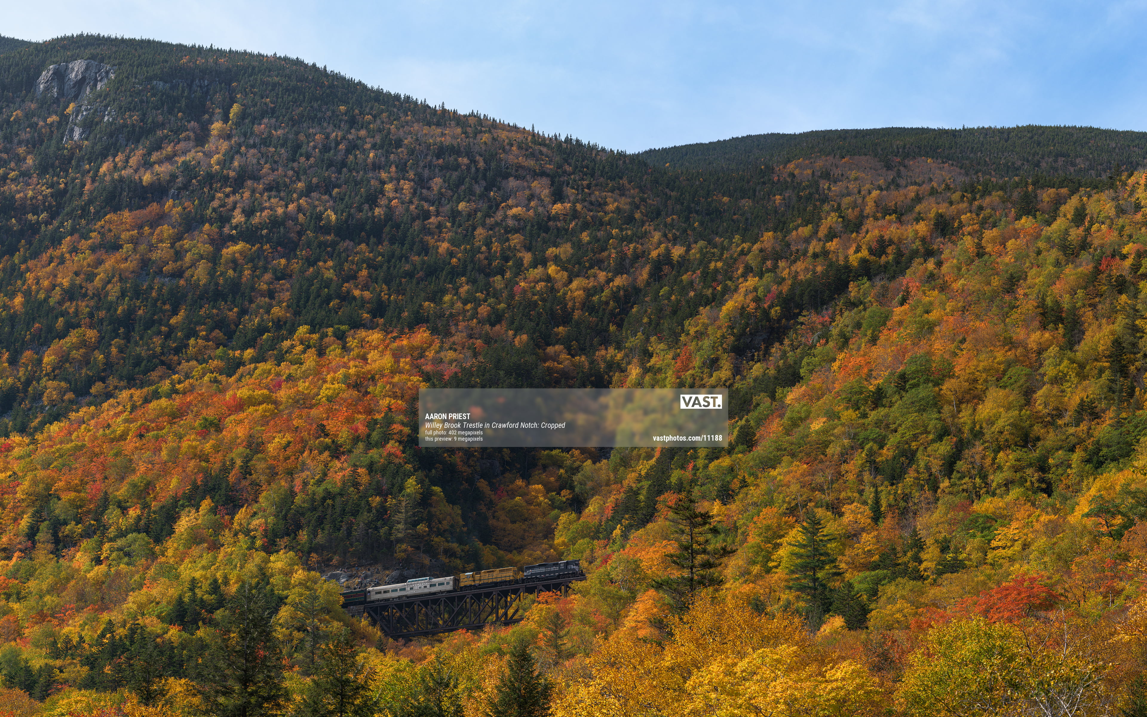 The Conway Scenic Railroad passes over the Willey Brook Trestle at Hart’s Location in the Crawford Notch of the White Mountains, New Hampshire, October 9, 2021, 12:24 – 13:41.