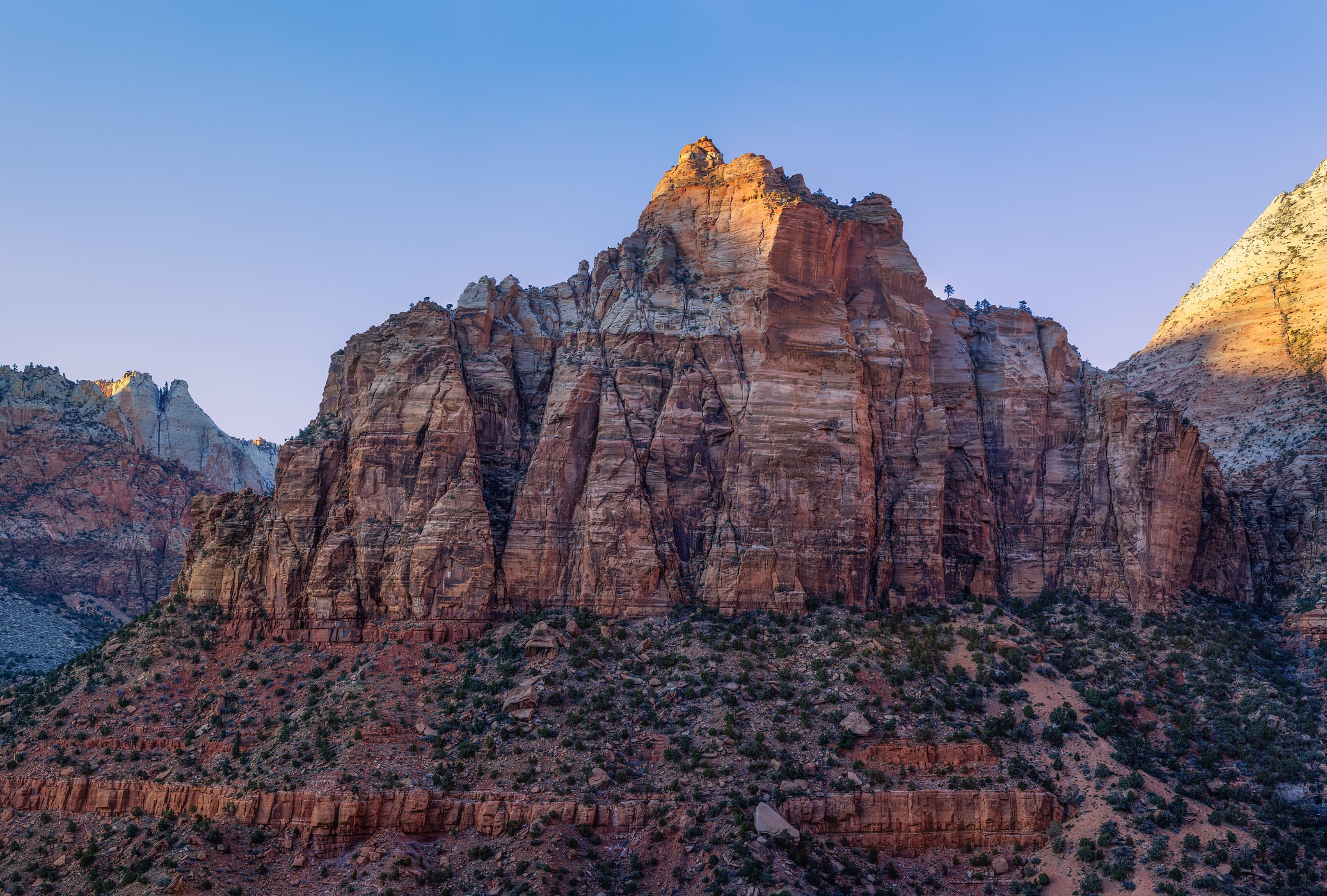 Mount Spry, a seemingly diminutive peak at 5,720 feet, rises proudly within the majestic confines of Zion National Park, crafted from the timeless Navajo Sandstone. In the fleeting moments of dusk, I seized the opportunity to capture its essence in this expansive photograph. As the day's final light waned and a cloudless sky loomed above, uncertainty loitered in my mind, casting doubt on the potential for a remarkable image.
